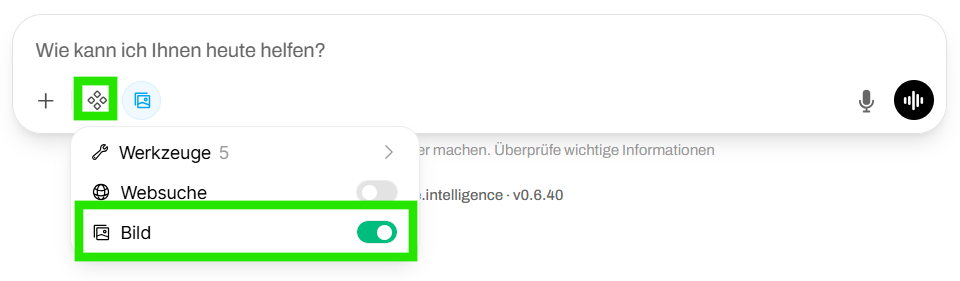 - Bei individuellen Modellen und eigenen Assistenten muss die Bildgenerierung zunächst explizit in den Modelleinstellungen aktiviert werden. Optional kann sie dort auch als Standardfunktion definiert werden, sodass bei jeder Antwort automatisch ein Bild erzeugt wird. Ansonsten ist die einzelne Aktivierung wie zuvor beschrieben erforderlich.