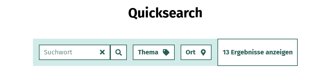 Die Quicksearch ist ein Modul, welches einen kompakten Erstkontakt mit Filterfunktion für User:innen darstellt. Sie kann aber jeder Seite platziert werden und ist so vielseitig einsetzbar.