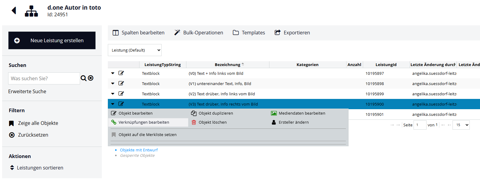 Das Hinzufügen von Verknüpfungen zu einem Textblock erfolgt aus der Liste der Leistungen. Nach Anklicken des kleinen Pfeils vor dem gewünschten Textblock den Eintrag "Verknüpfungen bearbeiten" auswählen. Anschließend können beliebig viele Verknüpfungen erstellt werden. So können pro Textblock andere Datensätze verknüpft werden und als Empfehlung ausgespielt werden.