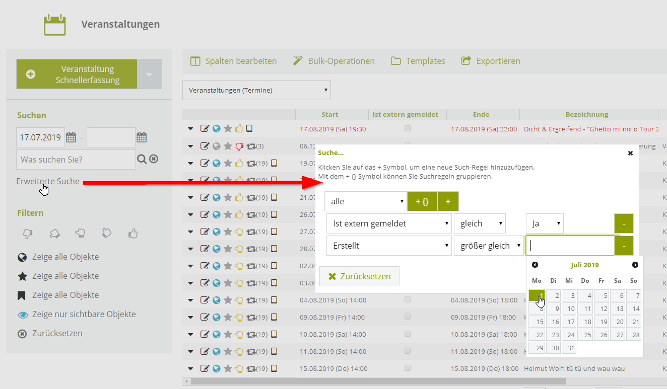 Abb. 3 eine erweitere Suche nach extern gemeldeten Events erstellen