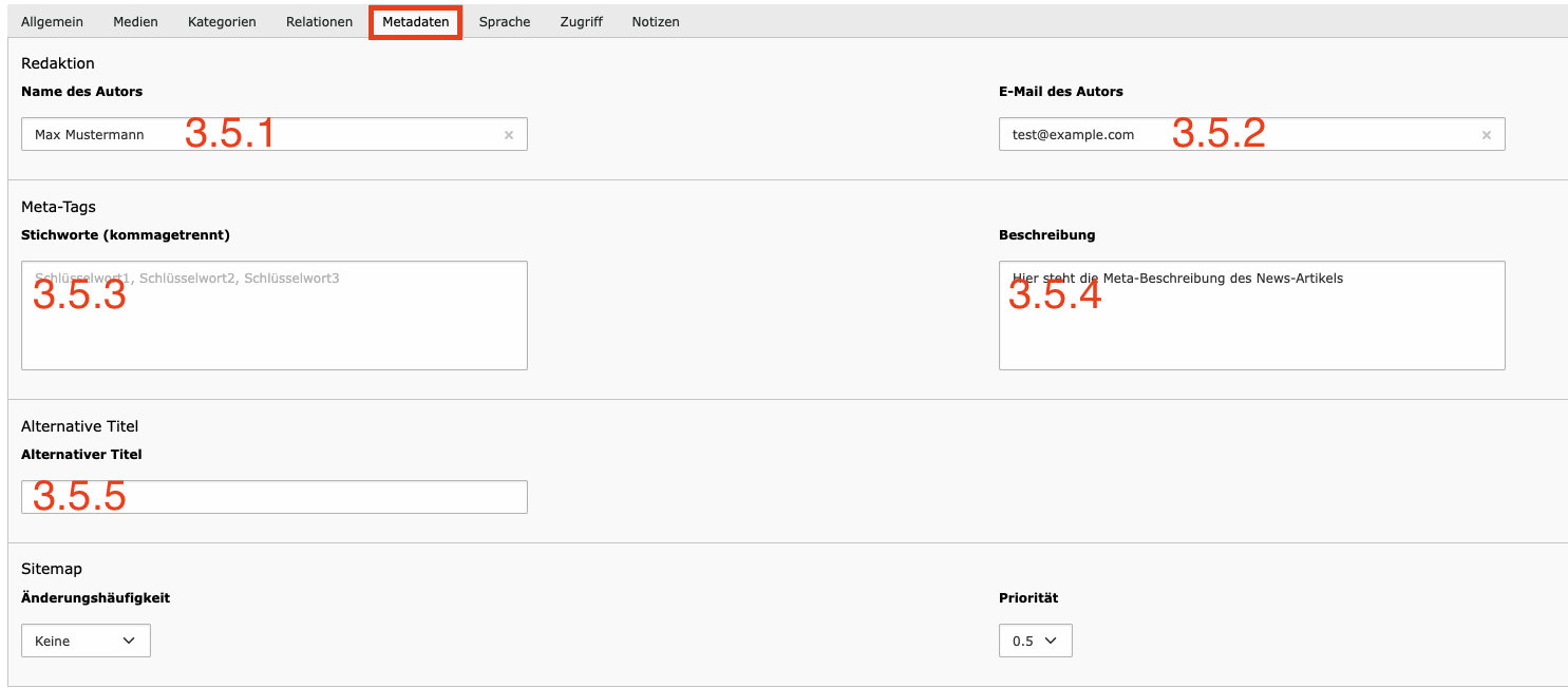 3.5 Reiter "Metadaten". Hier können die Metadaten des Artikels/Autors hinterlegt werden. Relevant ist dies für u.a. Suchmaschinen.