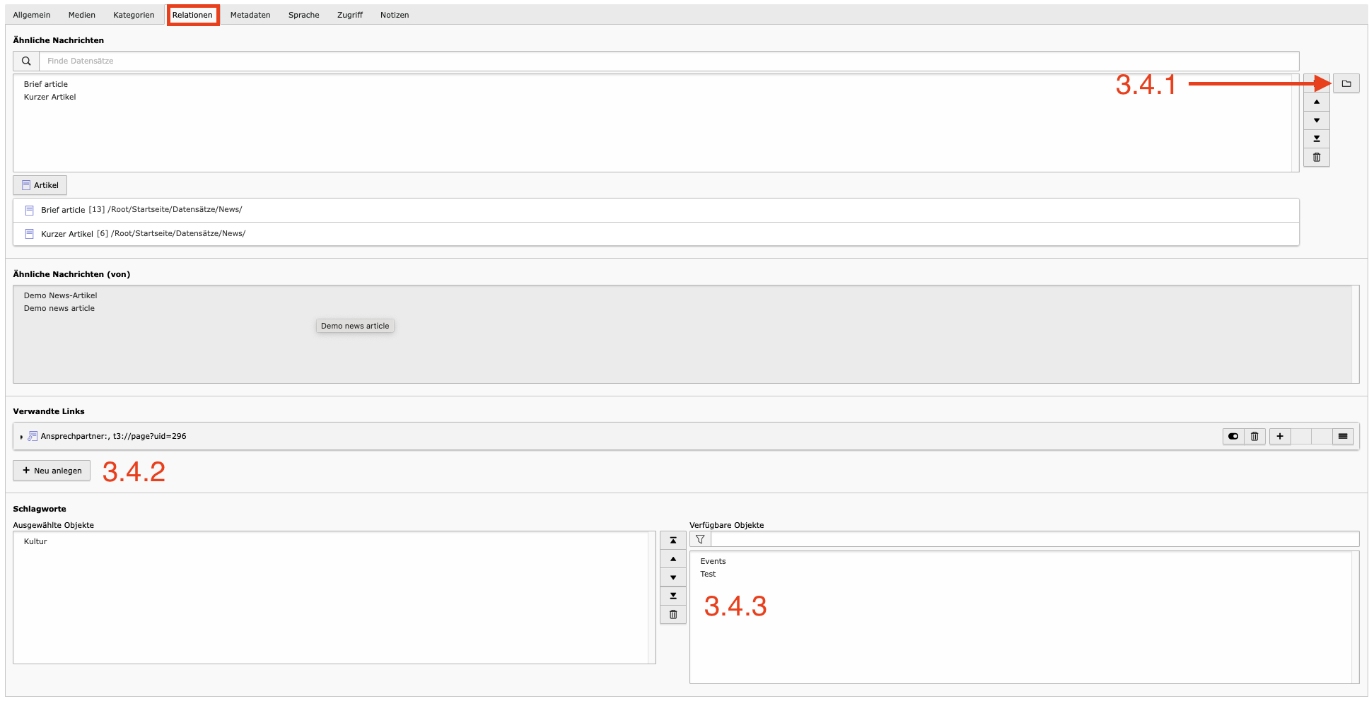 3.4.2 Mithilfe der Schaltfläche "Neu anlegen" können verwandte Verlinkungen hinterlegt werden. Diese werden unterhalb der News angezeigt.