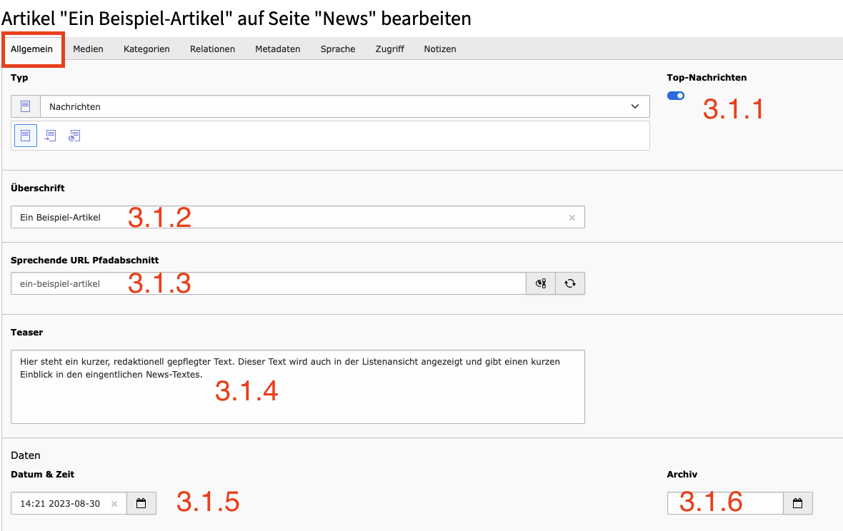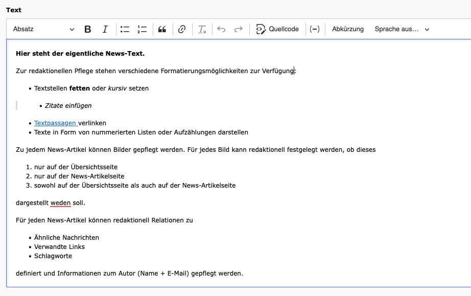 3.1.7 Hier kannst du nun den Inhaltstext des Artikels hinterlegen. Du hast dabei alle Formatierungsmöglichkeiten die du bereits aus Textmodulen in TYPO3 kennst.