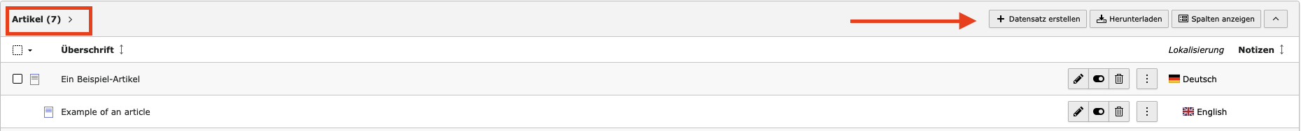 2. Scrolle nach unten zum Abschnitt "Artikel" und klicke hier auf "+Datensatz erstellen".