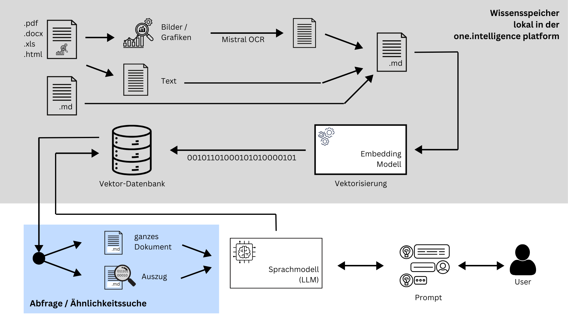 In der one.intelligence Platform können Wissensspeicher erstellt und Sprachmodelle mit diesen verknüpft werden, um präzise und kontextbezogene Antworten zu erhalten. Dieser Artikel beschreibt den Prozess des Dokumentenuploads, der Verarbeitung und wie die Modelle auf diese Daten zugreifen.