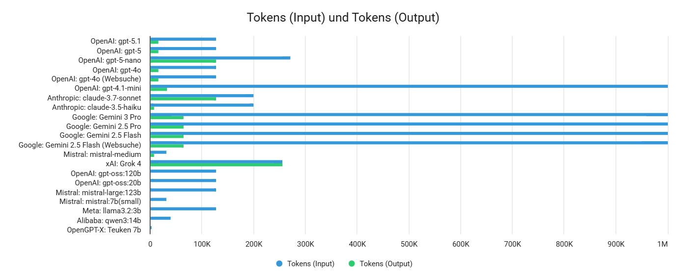 Für die Arbeit mit KI sind beide Werte entscheidend: Das Input‑Limit bestimmt, wie viel Kontext ein Modell berücksichtigen kann, während das Output‑Limit festlegt, wie umfangreich die resultierende Antwort ausfallen darf. Modelle mit besonders hohen Grenzen eignen sich vor allem für anspruchsvolle Szenarien, in denen große Mengen an Text verarbeitet und detaillierte Ergebnisse benötigt werden. Die folgende Visualisierung gibt einen Überblick über die Limits der in der Plattform verfügbaren Modelle.
