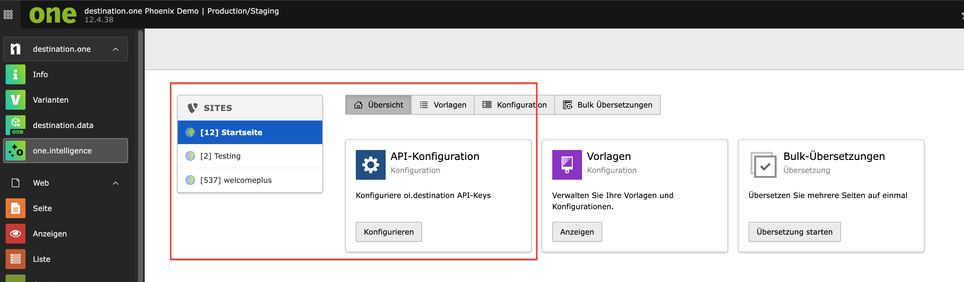 Sites, API-Konfiguration und Vorlagen sind nur für bestimmte Redakteur:innen sichtbar. Dies sollten nicht per se alle Redakteur:innen sein, da hier die Grundeinstellungen für die Verknüpfung von TYPO2 zur oi.platform hinterlegt werden. Die Funktion ist vergleichbar mit Admins für destination.data. Diese haben mehr Rechte und somit den Überblick und die Handhabe über die Konfigurationen. Die KI-Funktionen selbst können jedoch dann von allen Redakteur:innen genutzt werden.
