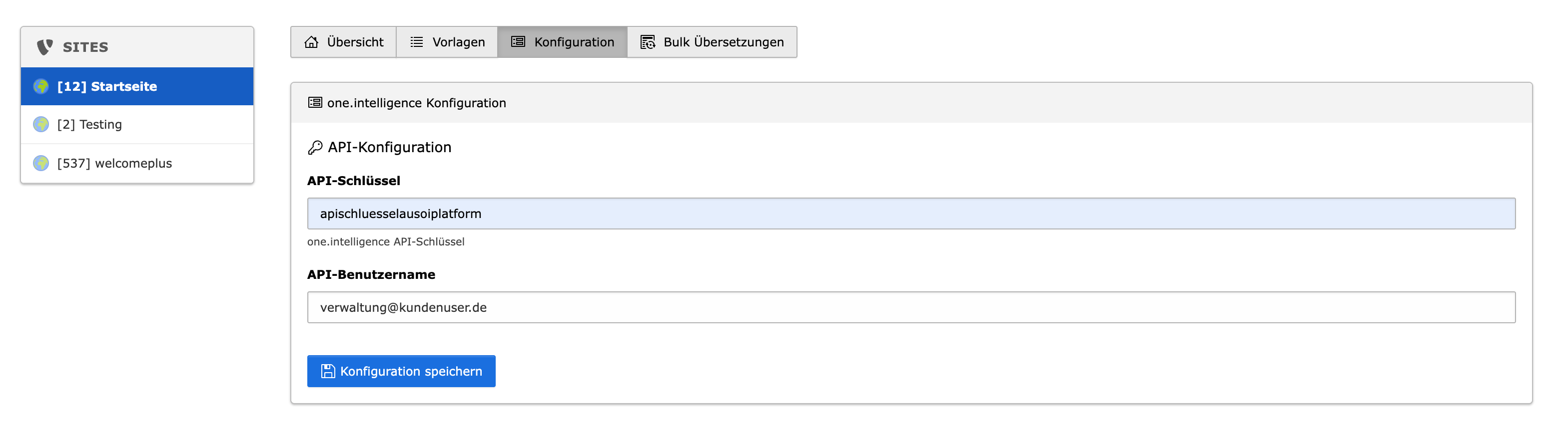 - Hinterlegt diesen API‑Key anschließend in der one.intelligence Maske vom TYPO3 unter "API-Schlüssel".