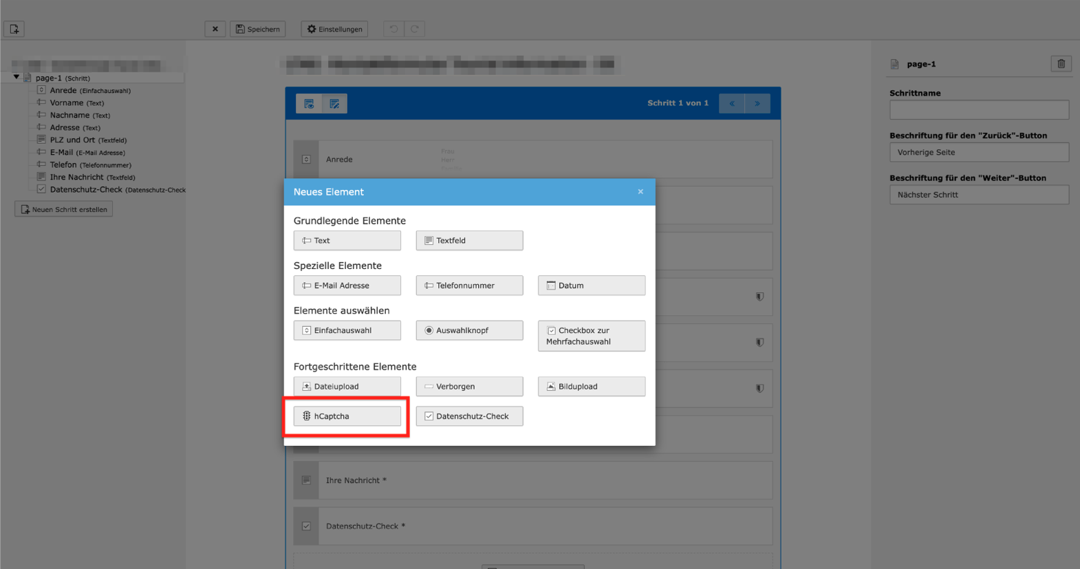 Nach der einmaligen Aktivierung der Captcha-Funktionalität steht das Captcha-Feld als Element im Formular zur Verfügung und kann für jedes Formular beliebig eingebunden werden: