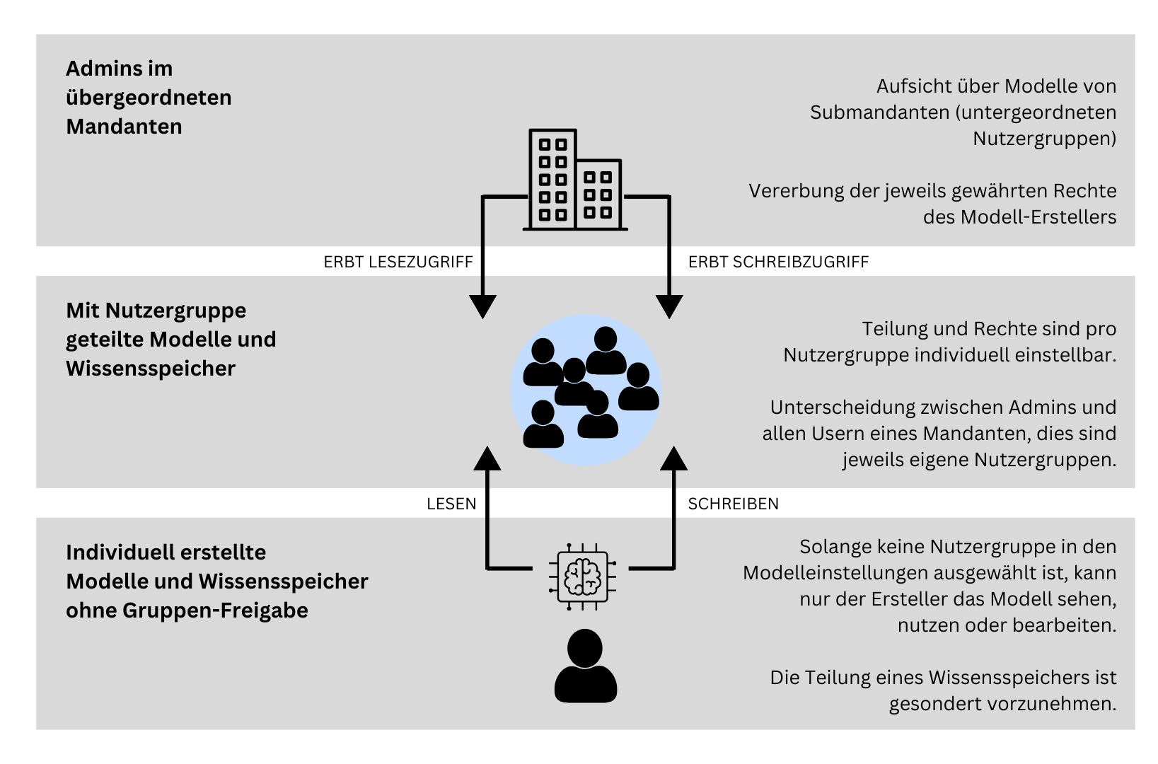 Der Ersteller kann seine Inhalte (Modelle, Wissensspeicher etc.) mit einer oder mehreren Nutzergruppen teilen. Dabei gibt es zwei verschiedene Zugriffslevel: Lesezugriff und Schreibzugriff.