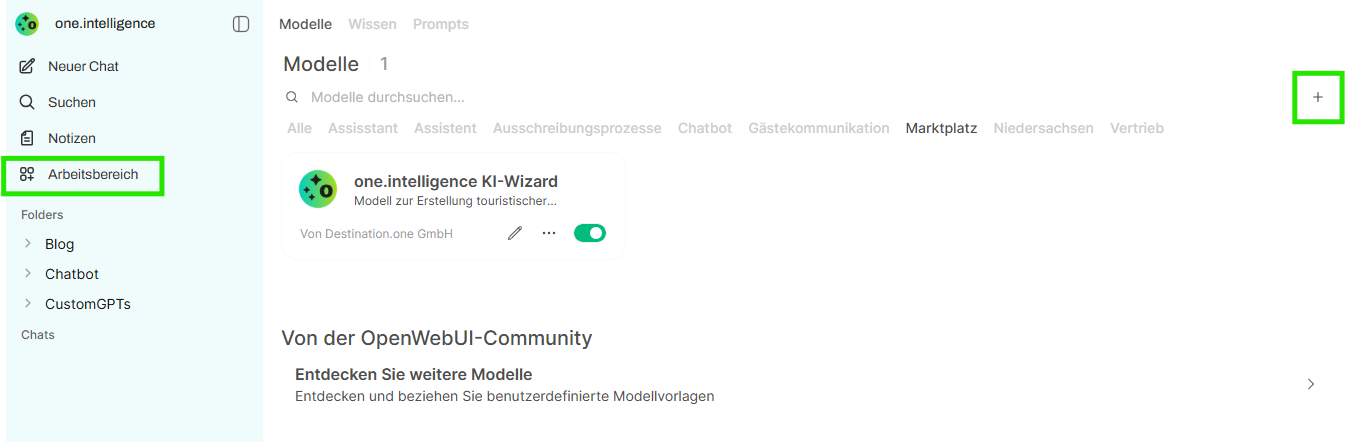 Wissensdatenbank auswählen (Mit dieser Funktion lassen sich bestehende Wissensdatenbanken in der one.intelligence platform mit dem neuen Modell verknüpfen. Ggfs. ist also das Modell zwischenzuspeichern und ein neuer Wissensspeicher anzulegen. Dafür muss im Arbeitsbereich oben links in der Ecke der Menüpunkt Wissen ausgewählt werden, nun kann über das kleine "+" am rechten Rand ein neuer Wissensspeicher angelegt werden - mit Namen, Kurzbeschreibung und den gleichen Rechten für Nutzergruppen wie beim Modell selbst. Ist der Wissensspeicher angelegt, kann dieser in den Modell-Einstellungen mit dem neu angelegten Modell verknüpft werden. Dabei sind auch mehrere Wissensspeicher pro Modell möglich, die im System-Prompt des Modells mit # gezielt angesprochen werden können. BSP: Nutze für deine Antworten die hinterlegten #Sprachstil.