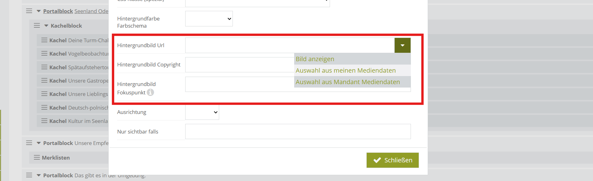 Lade eigene Bilder als Hintergrundbilder hoch, um den Portalblöcken noch mehr Inspirations-Charakter zu verleihen. Diese kannst du dann über die Medien im Mandanten auswählen.