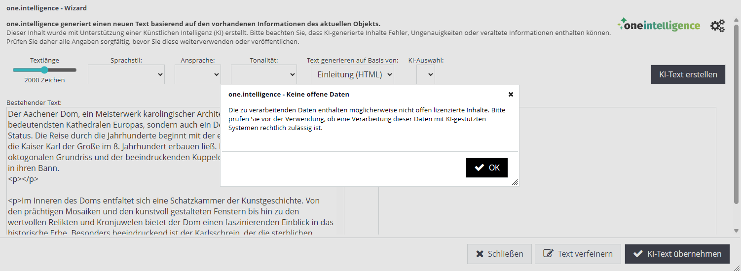 Wenn KI nicht offene Daten verwendet wird nun eine Information angezeigt.