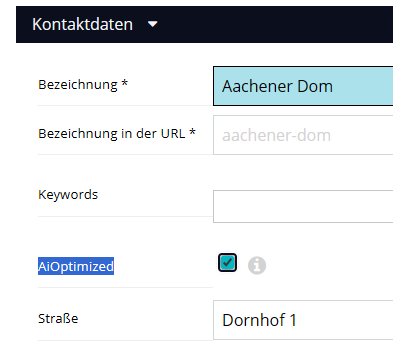 Bei allen deinen Stammdaten und bei Mediendaten wird das Feld AIOptimized automatisch aktiviert, sobald du KI‑gestützte Texte erstellst.