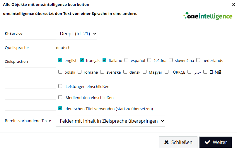Bei Bulk-Bearbeitung sind nun alle in data verfügbaren Sprachen auswählbar um entsprechende Übersetzungen von der KI erzeugen zu lassen.