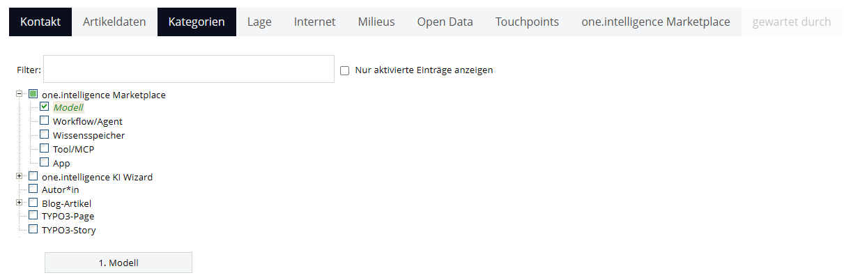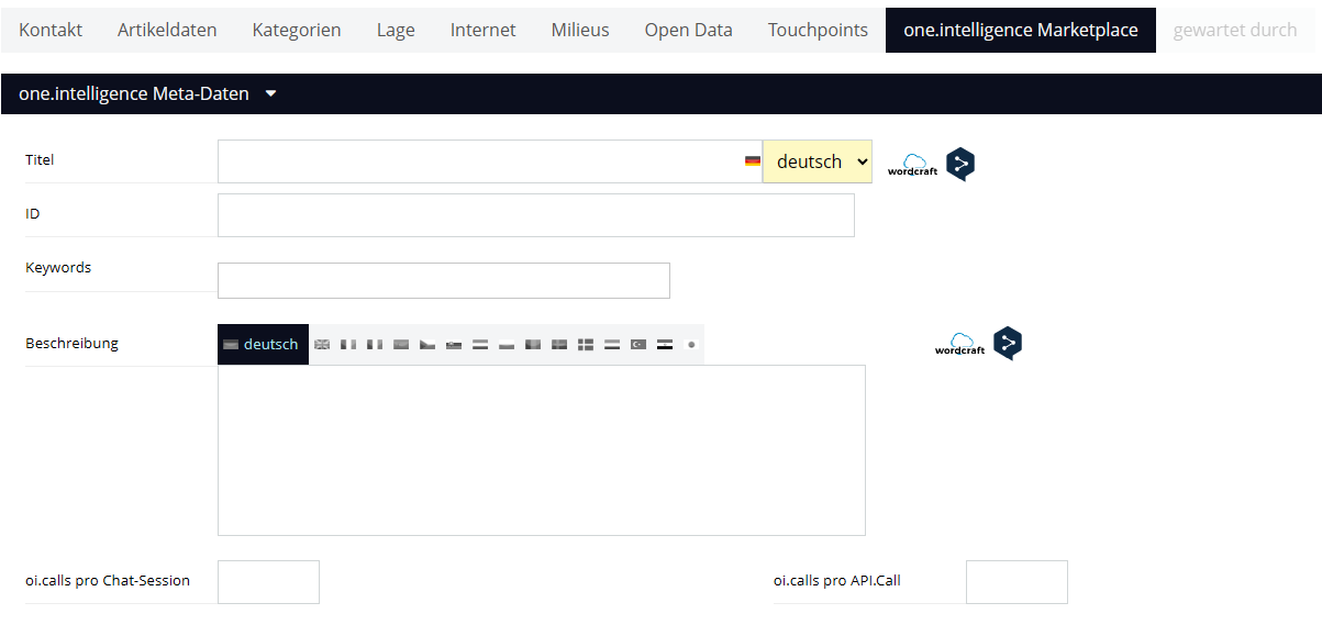 Neue Oberkategorie: "one.intelligence Marketplace". Darunter gibt es nun "Modell", "Workflow/Agent", "Wissensspeicher", "Tool/MCP" und "App". Wenn eine dieser Kategorien ausgewählt ist, gibt es nun ein neues Tab, wo folgende Felder gepflegt werden können: "Titel", "ID", "Keywords", "Beschreibung", "oi.calls pro Chat-Session" und "oi.calls pro API.Call". Diese werden an die meta übertragen und dann auch bald auf https://marketplace.destination.one/ ausgegeben.