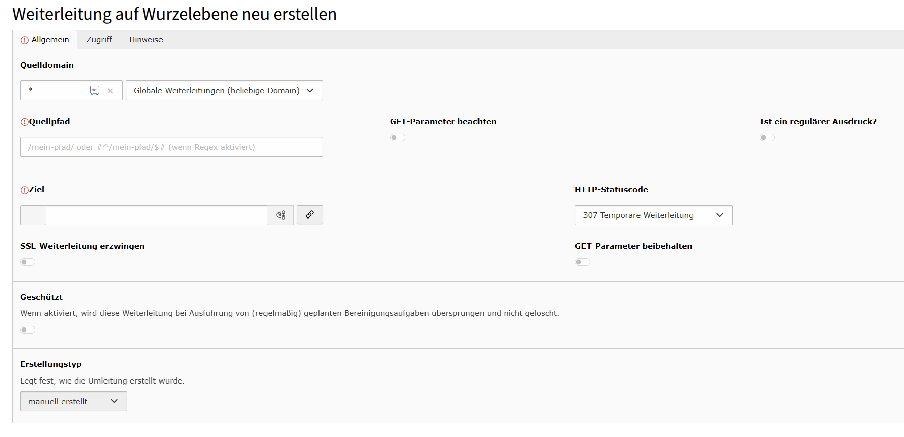 Weiterleitungen können im Backend unter dem Menüpunkt „Weiterleitungen“ redaktionell gepflegt werden. Es können folgende HTTP-Statuscodes gewählt werden: