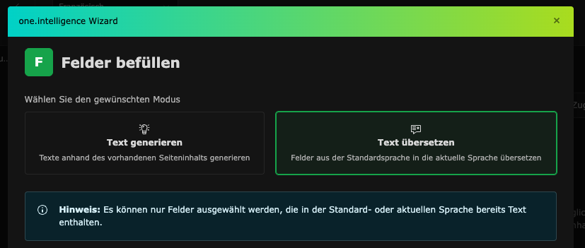 2. Text in eine weitere Sprache übersetzen: erstellt eine 1:1 Übersetzung des vorhandenen Textes der Felder der Standardsprache