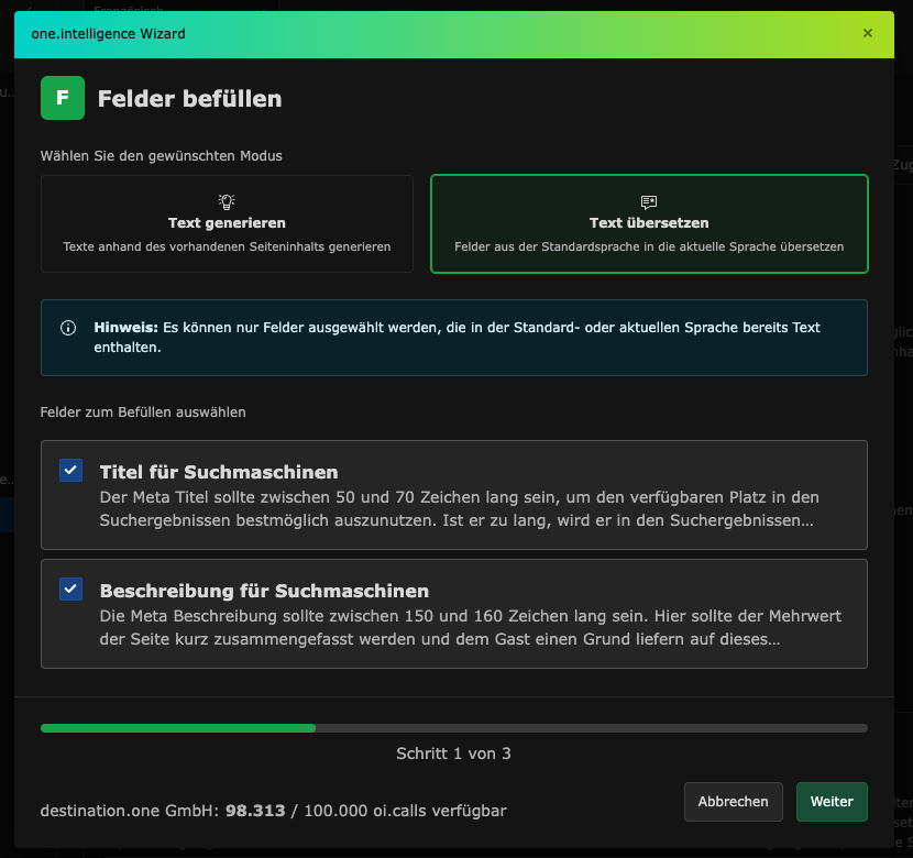 Es können nur Felder für die Übersetzung ausgewählt werden, die in der Standard- oder aktuellen Sprache bereits Text enthalten.Sobald Ihr dann beim ersten Schritt auf "weiter" klickt, ist das Vorgehen gleich zur Erstellung der deutschen Texte. Je nach dem, wie Ihr die Vorlagen nutzt, kann es sinnvoll sein, dass Ihr noch Vorlagen für die mehrsprachigen Inhalte anlegen müsst.