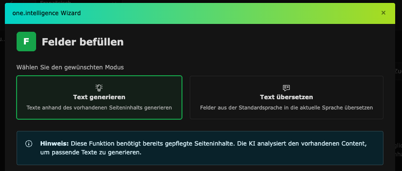 1. Text in einer weiteren Sprache generieren: erstellt einen neuen Text in der Mehrsprachigkeit anhand der gepflegten Inhalte der Seite