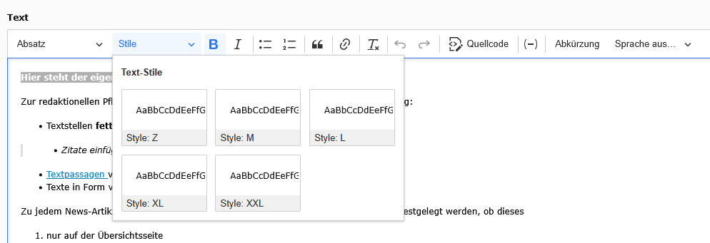 Im Newsmodul können im Fließtext nun Überschriften formatiert werden. Dafür wurde im RTE die Stil-Auswahl ergänzt.
