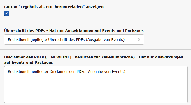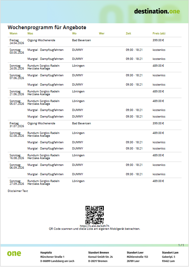 📅 Das neu gestaltete PDF stellt Events und Packages als übersichtlichen Wochenplan dar. Im Plugin lassen sich redaktionell Titel und ein Disclaimer-Text anpassen; beide werden am Ende des PDFs angezeigt. Ein integrierter QR-Code führt direkt zur vorher erstellten Ergebnisliste. Für die Ausgabe von POIs, Touren, Gastronomie und Gastgeber:innen bleibt das bestehende PDF-Format erhalten.