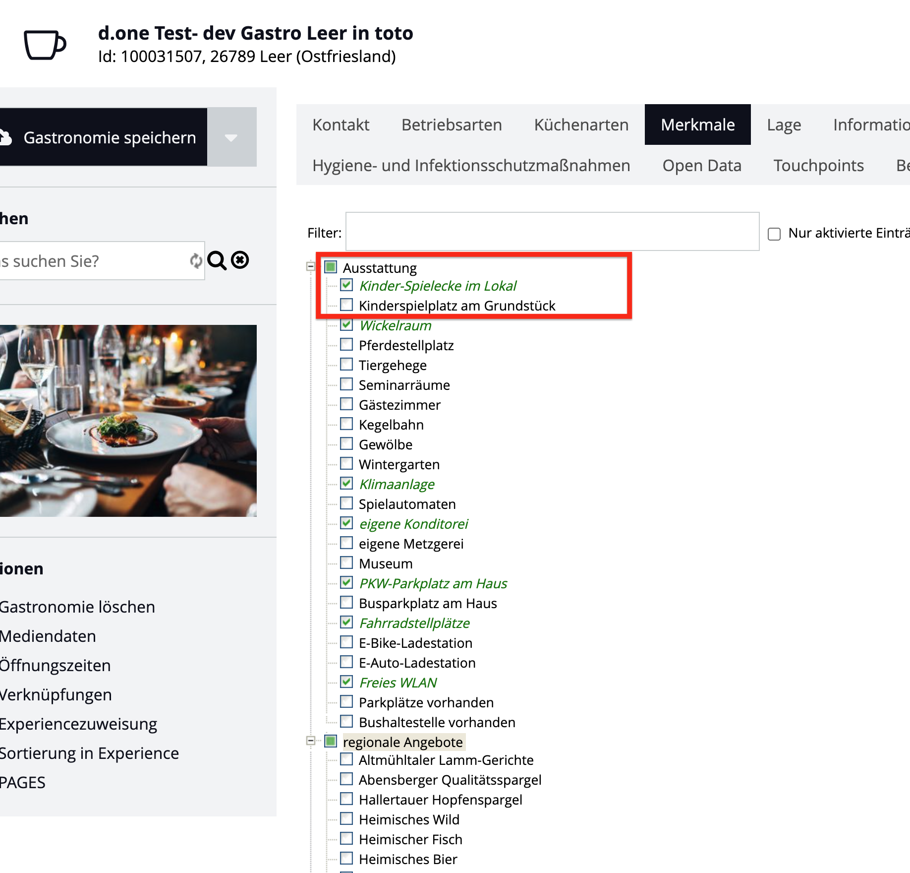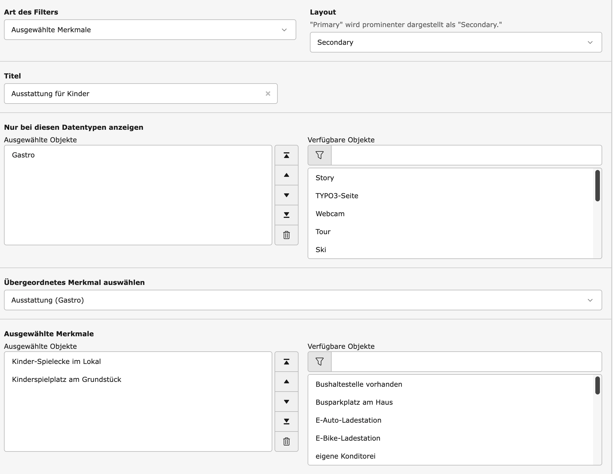 Ihr möchtet einen Filter für Ausstattung, der nur die Merkmale zeigt, die für Kinder relevant sind. So könnt Ihr im TYPO3 Backend das übergeordnete Merkmal wählen und im zweiten Schritt bestimmen, welche Unter-Merkmale im Filter erscheinen sollen: